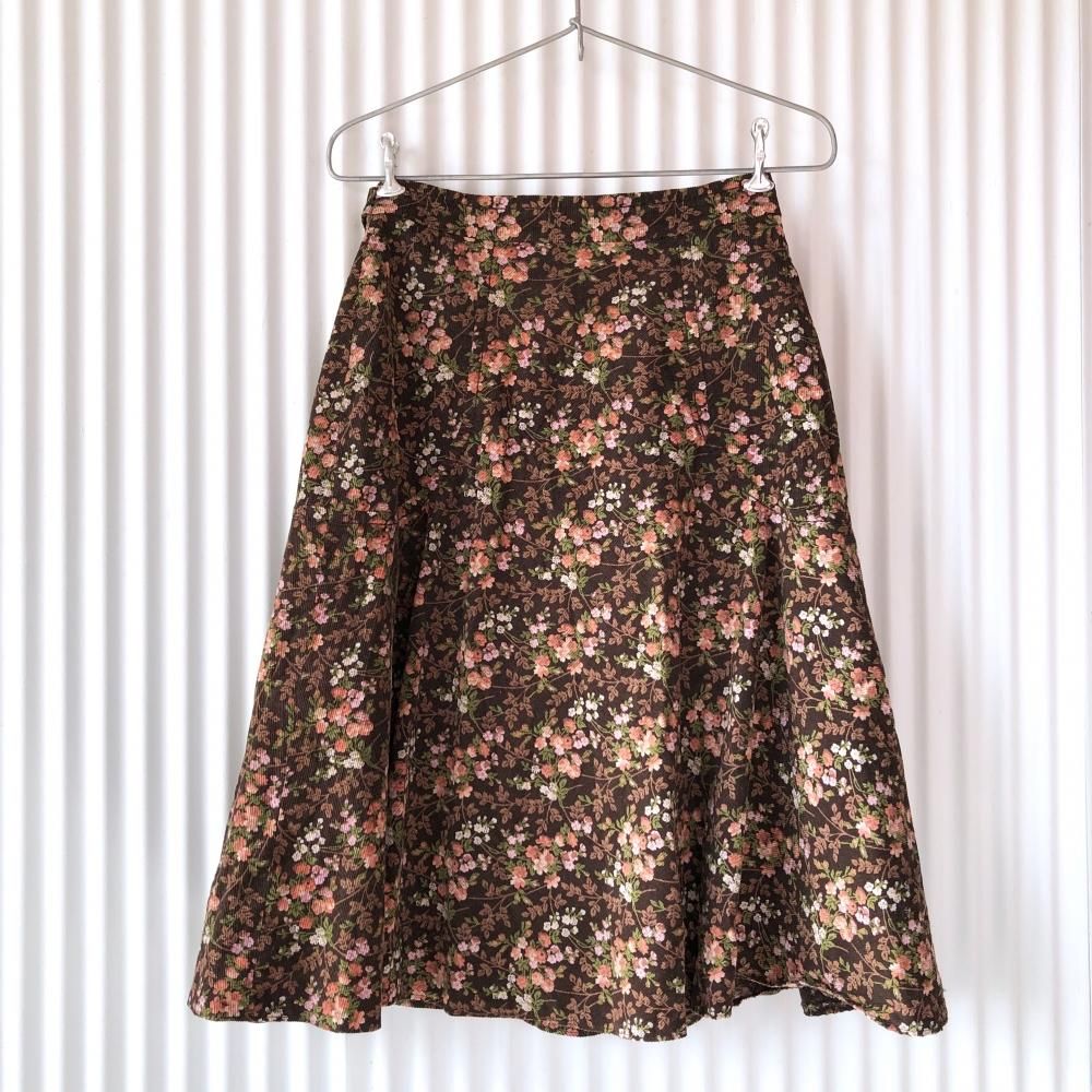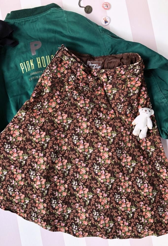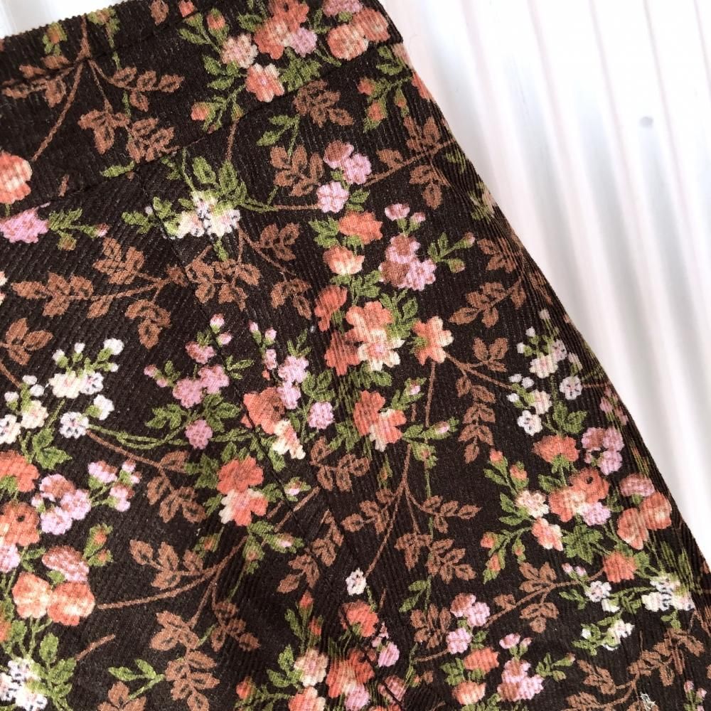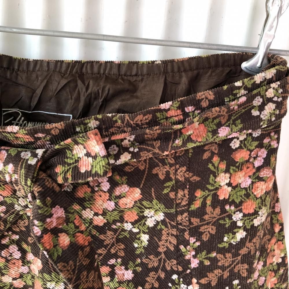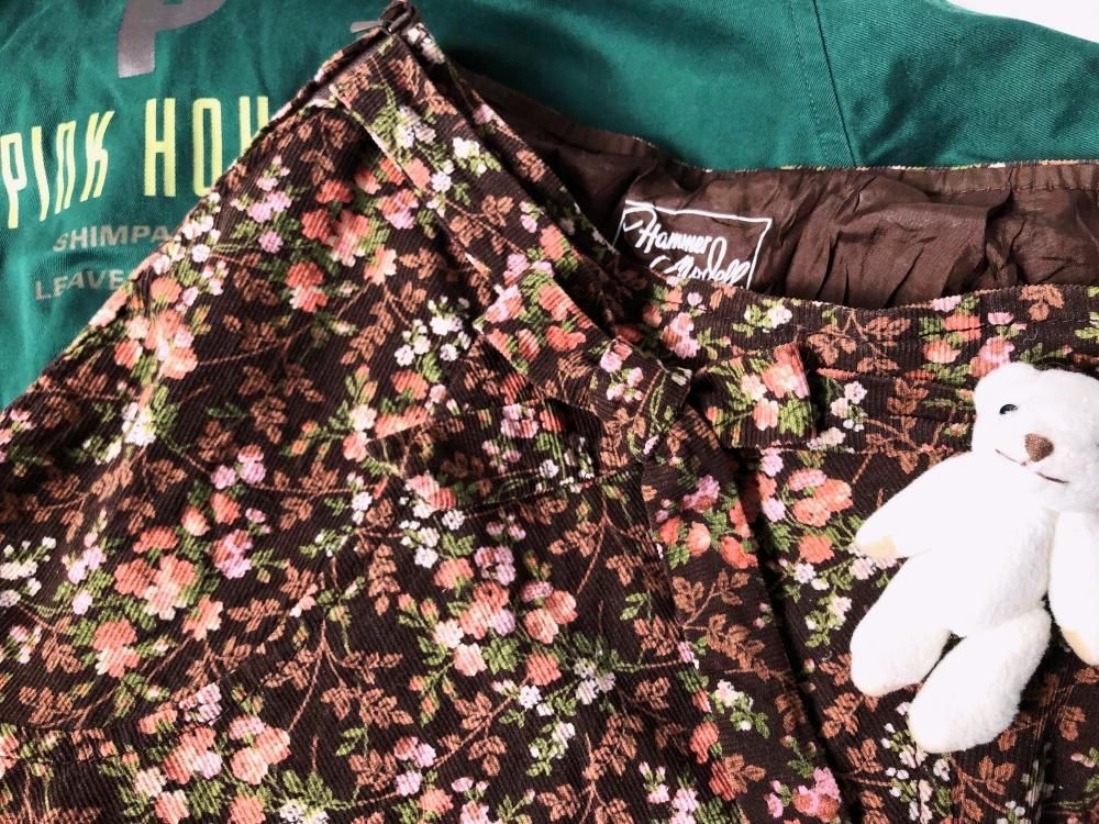 ブラウンベースに可憐なお花柄。極細コーデュロイのUSスカート。ウエストには同布のリボンが。ふんわりと広がって膝下ミドル丈でガーリーに。裏地付き。