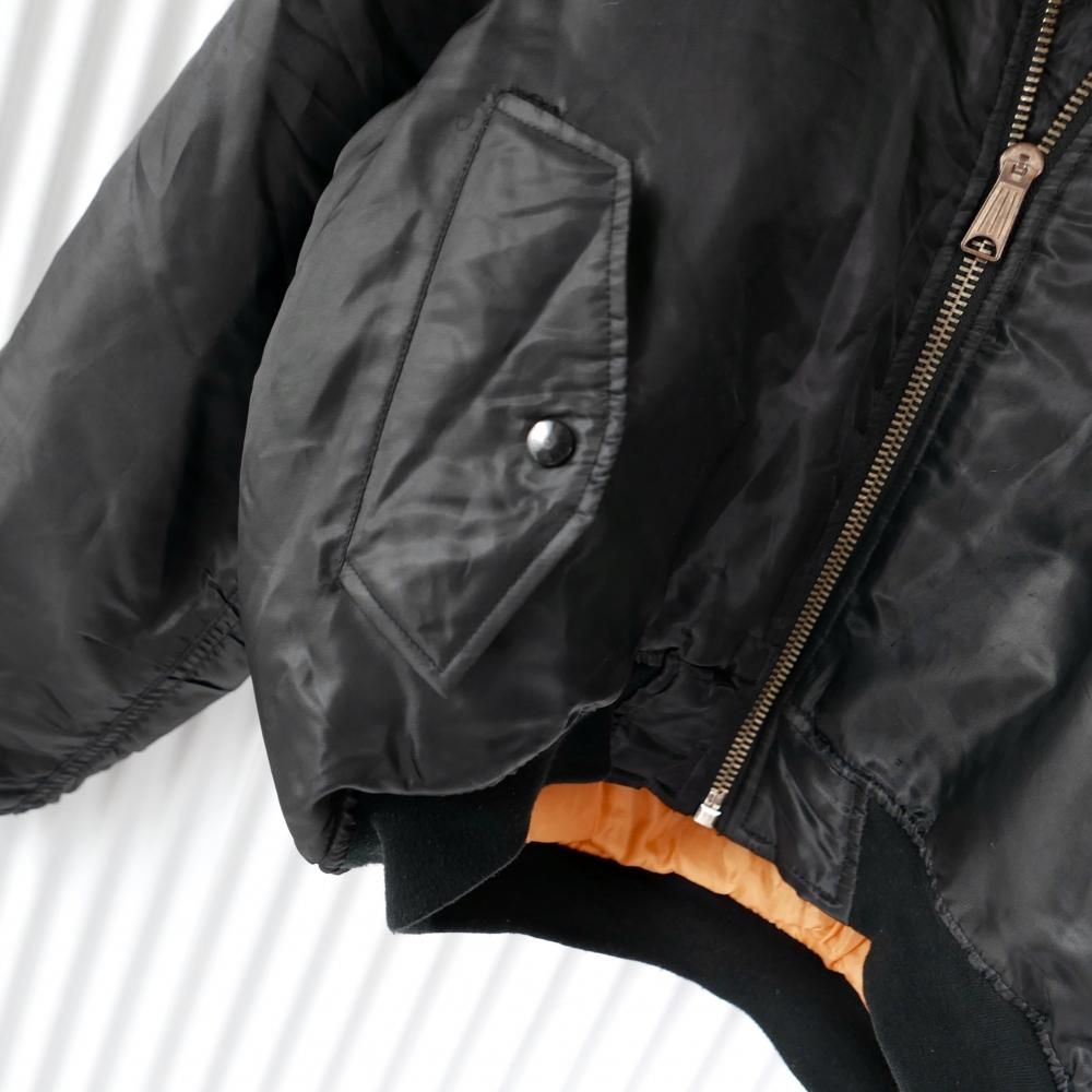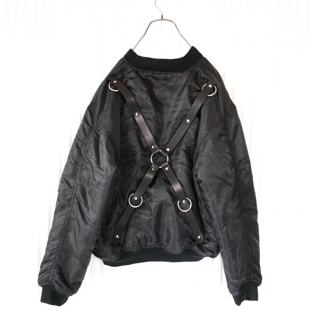 シンプルなブラック×オレンジのリバーシブルMA-1かと思いきや、背中にゴツいクロスベルトが。ハーネスのようでインパクトあり。身幅広め。中綿入り。