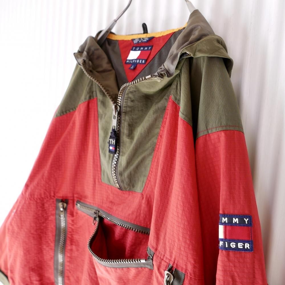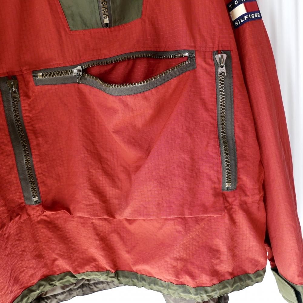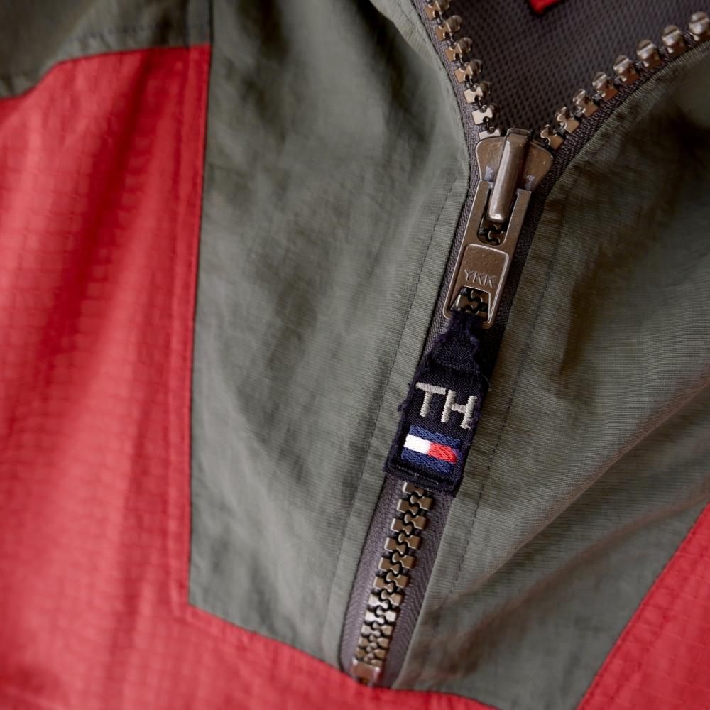 ガバっとBIGなシルエットがTOMMYらしいアノラック。煉瓦色×カーキグリーンの切り替えデザイン。おなかの大きなポケットの3方に付けられたジッパーがゴツめでデザインのアクセントに。肩にはTOMMYロゴワッペン。