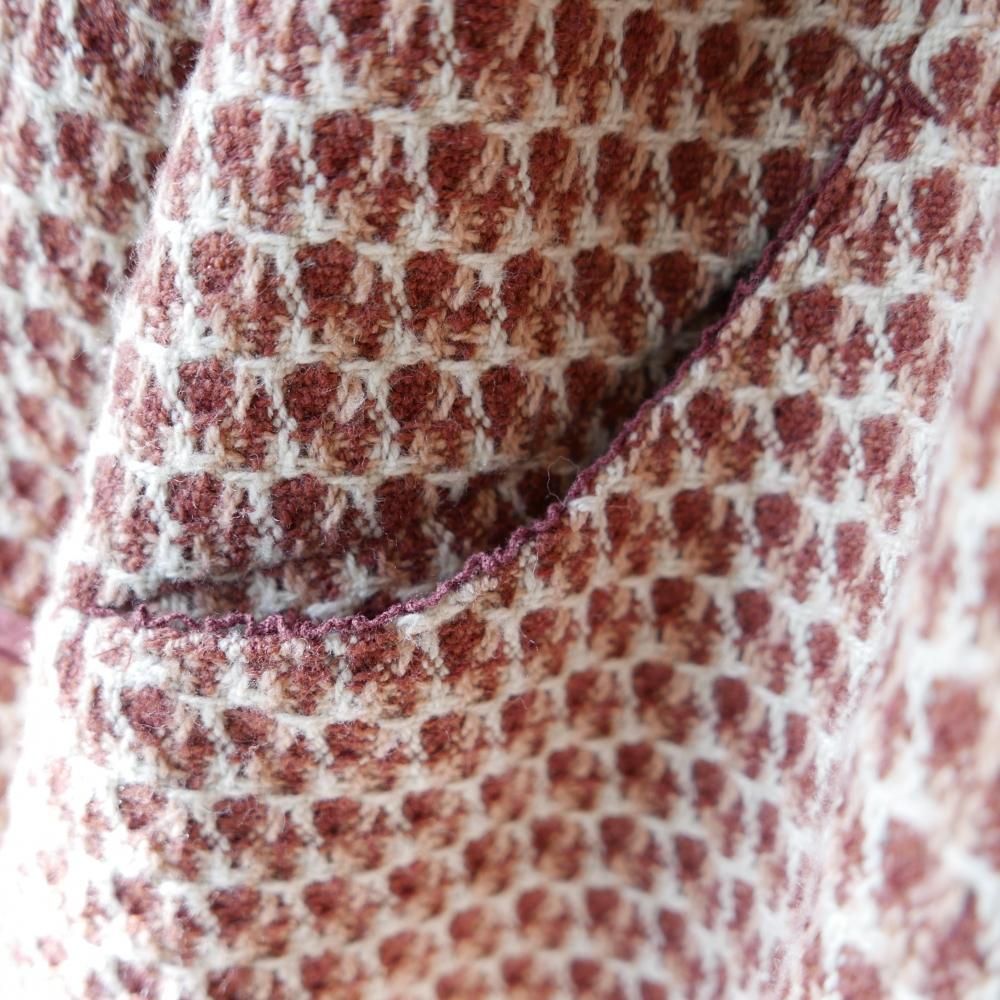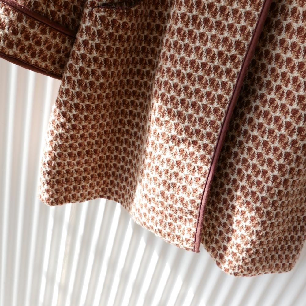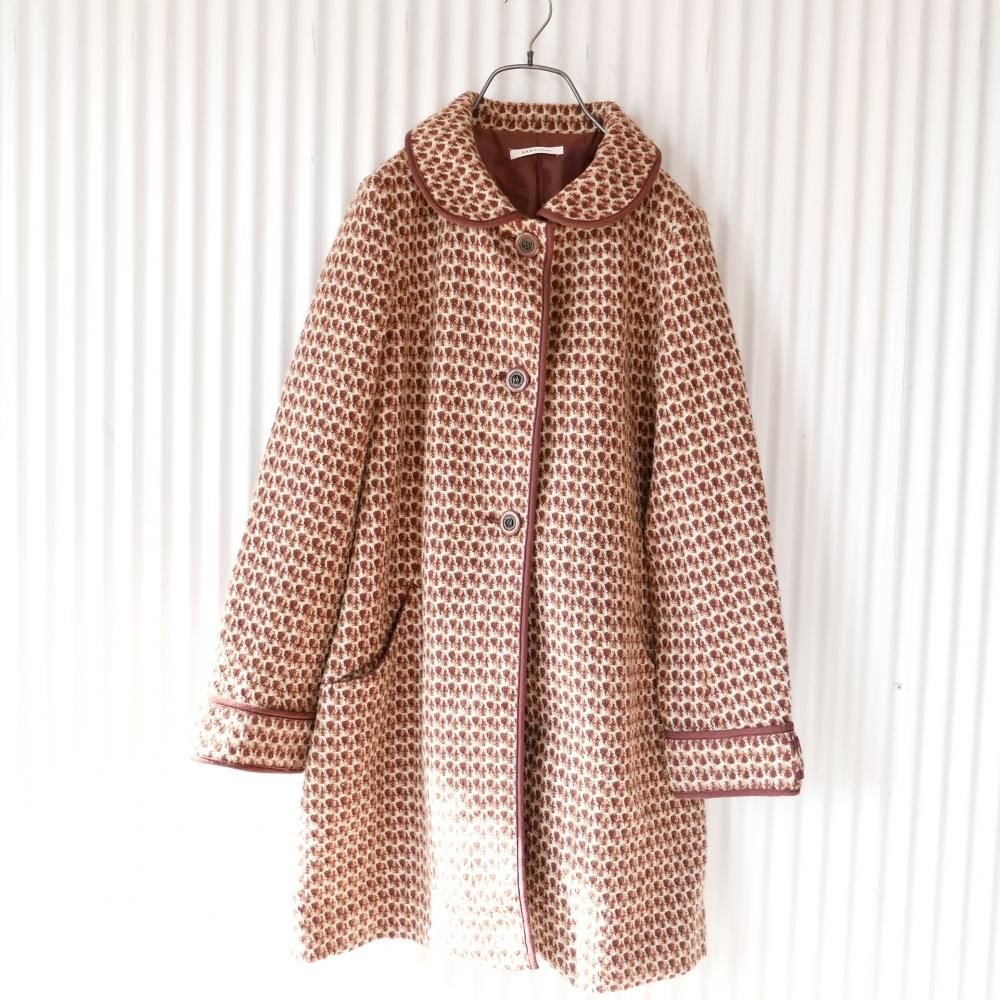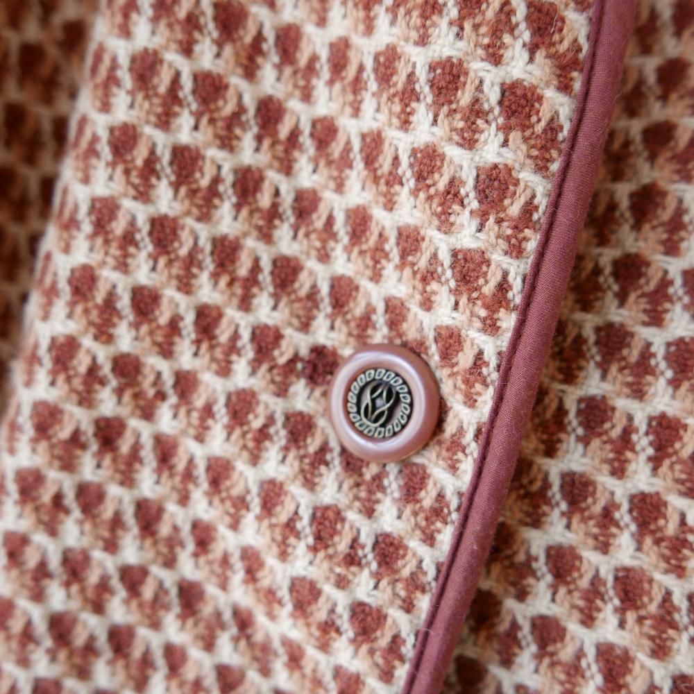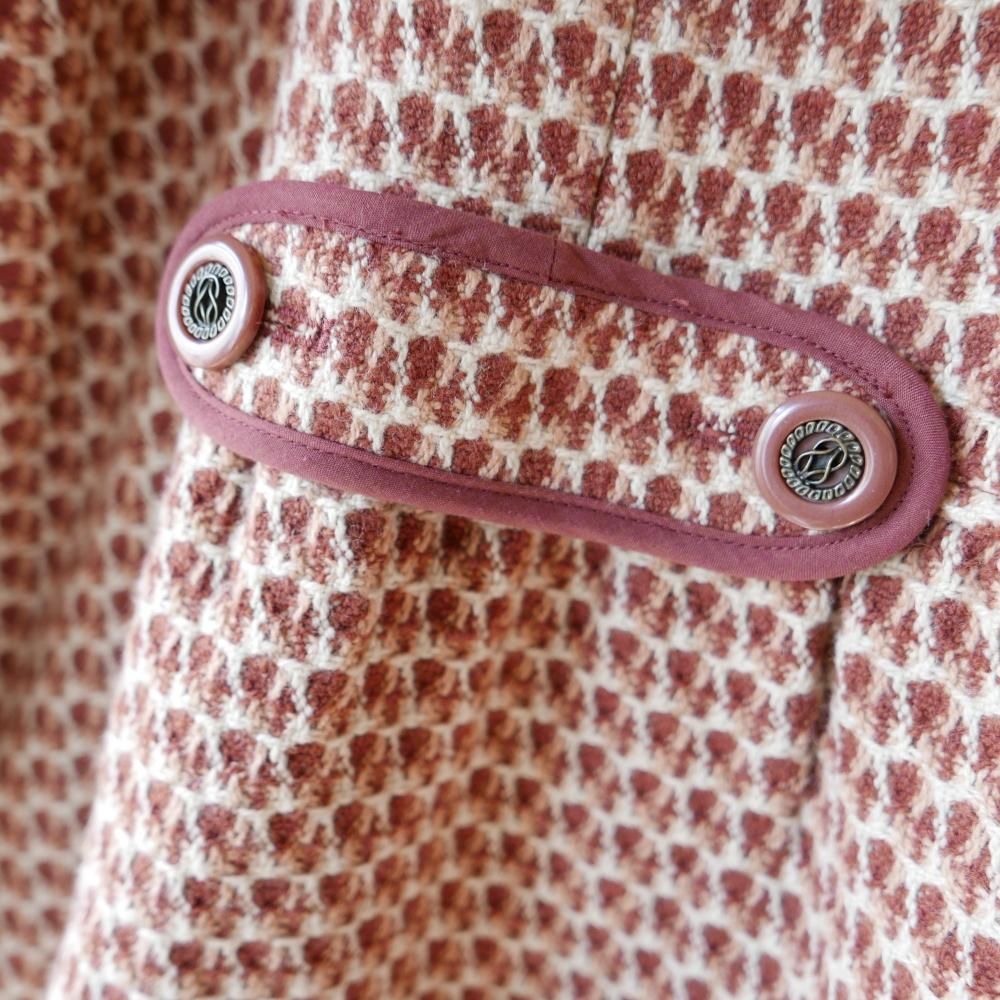 ほっこり暖色系のミルキーベージュ×ピンクブラウンのウール織柄。襟と袖口のパイピングデザインで引き締めて。アンティークデザインの大きなボタンも素敵。レトロコーデにぴったりなコートです。