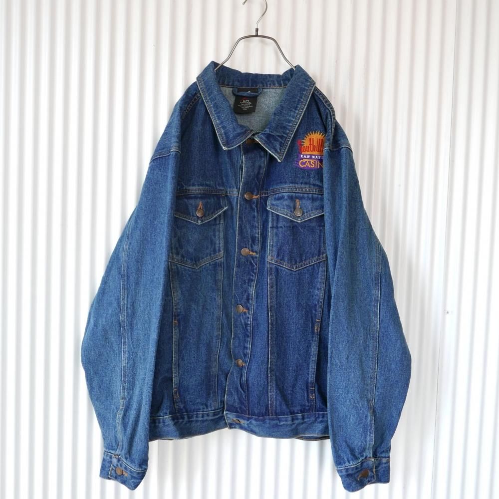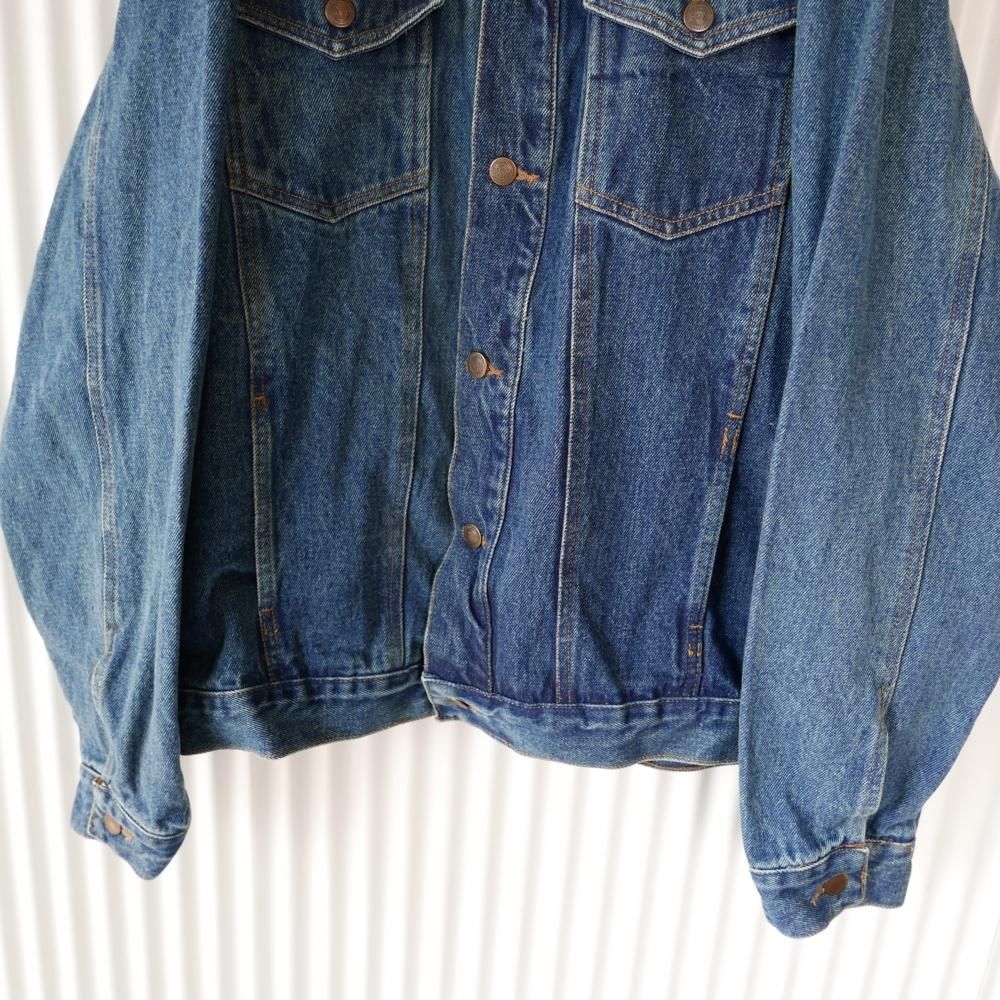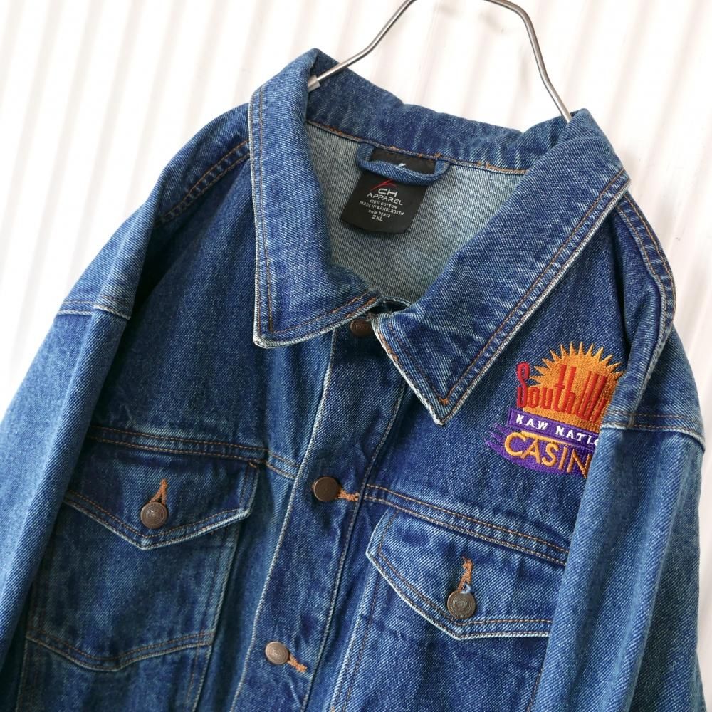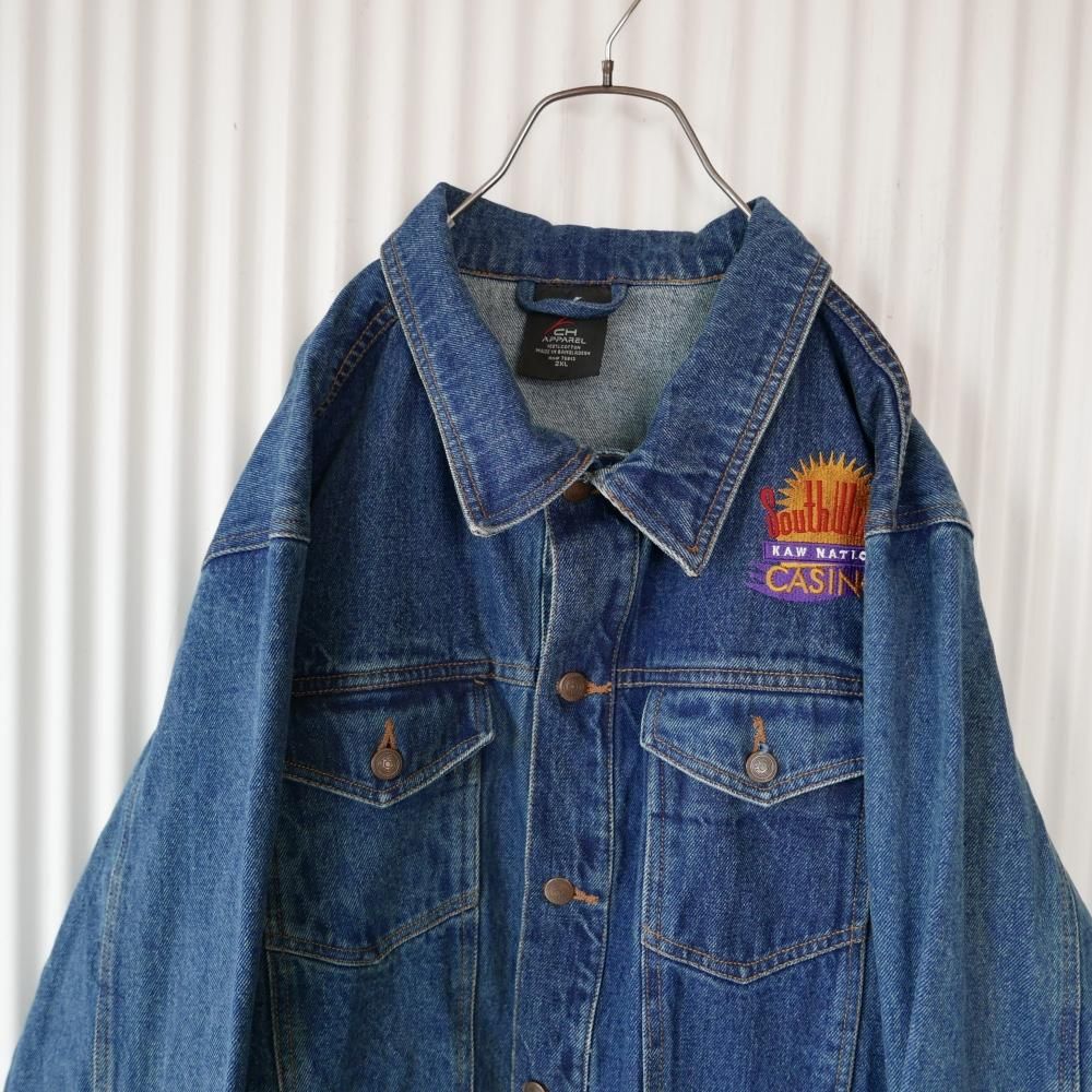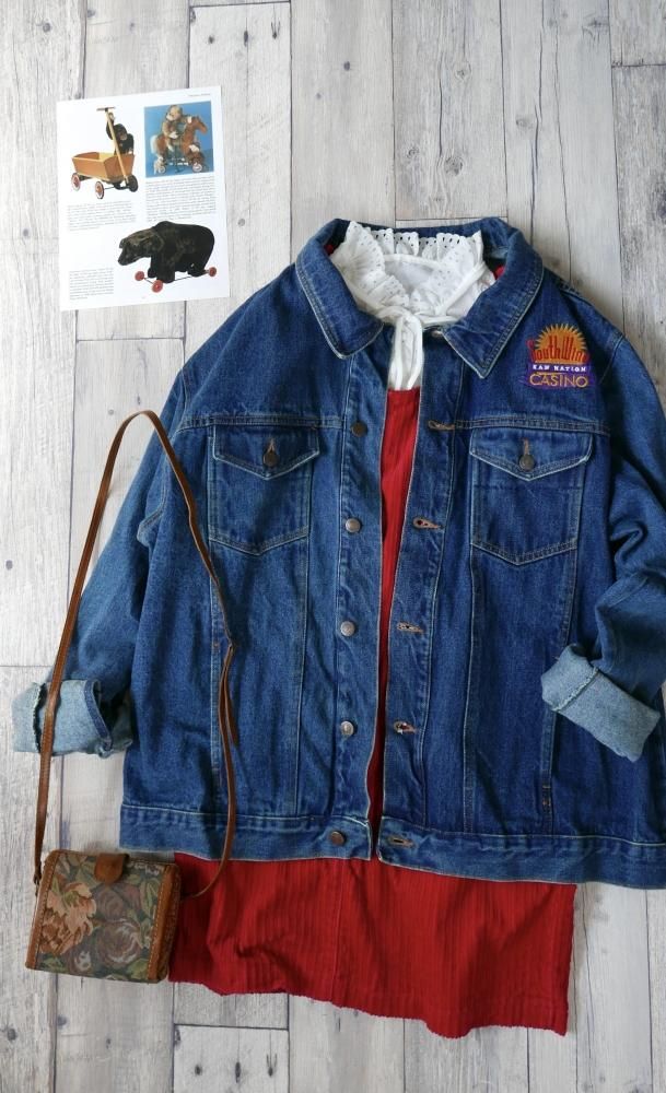 胸の刺繍デザインがポップなUSデニム。BIGサイズで160cmでおしりがすっぽり隠れる丈感で、幅も広め。柔らかさのある生地なので女性が着ても肩が張ることなく、ゆるシルエットで着用できます。