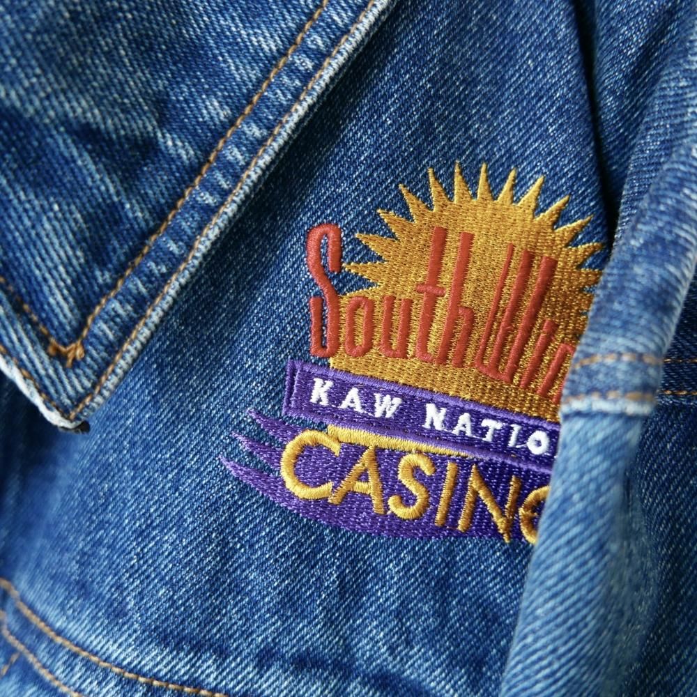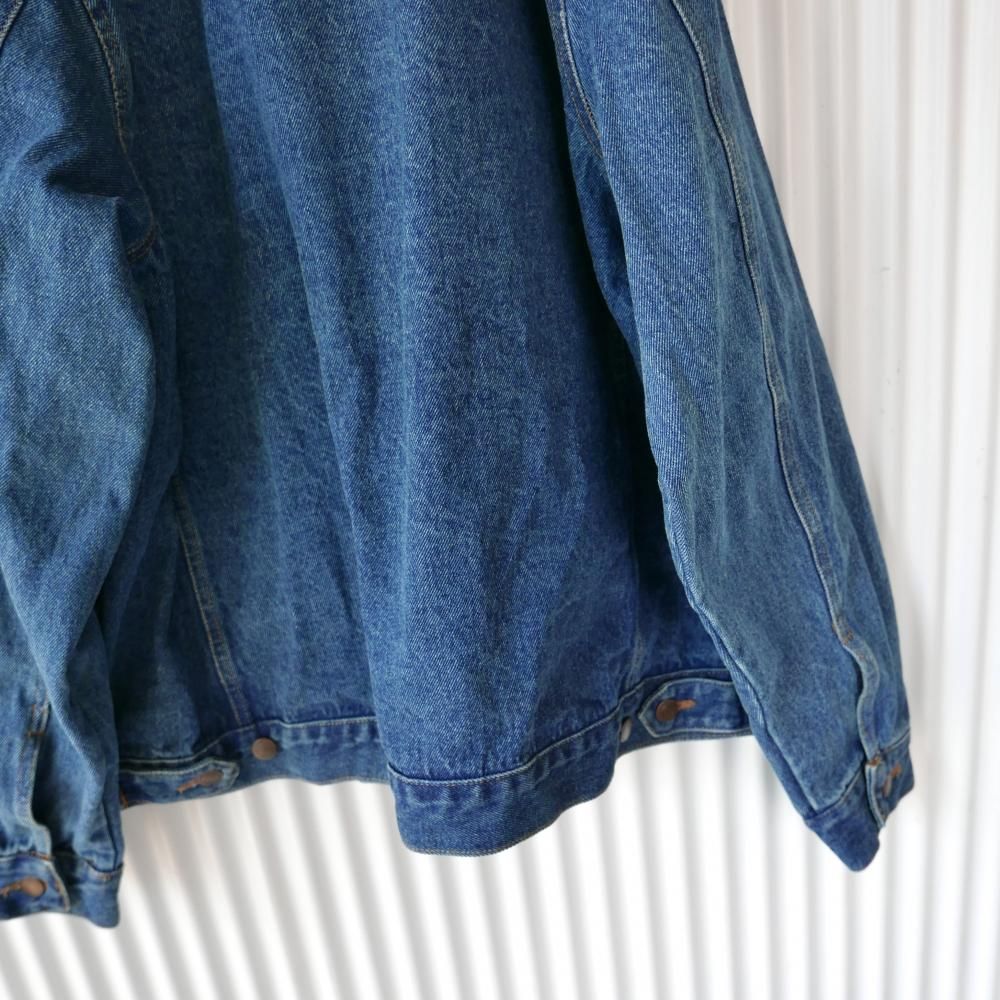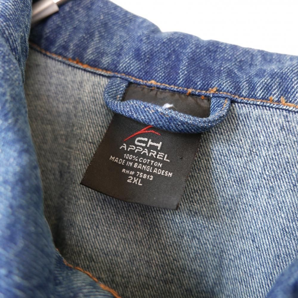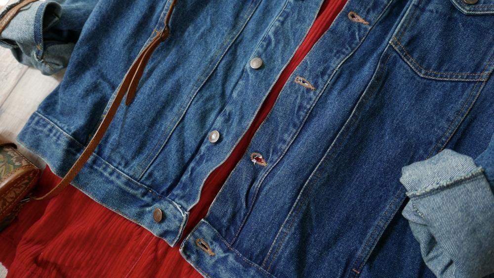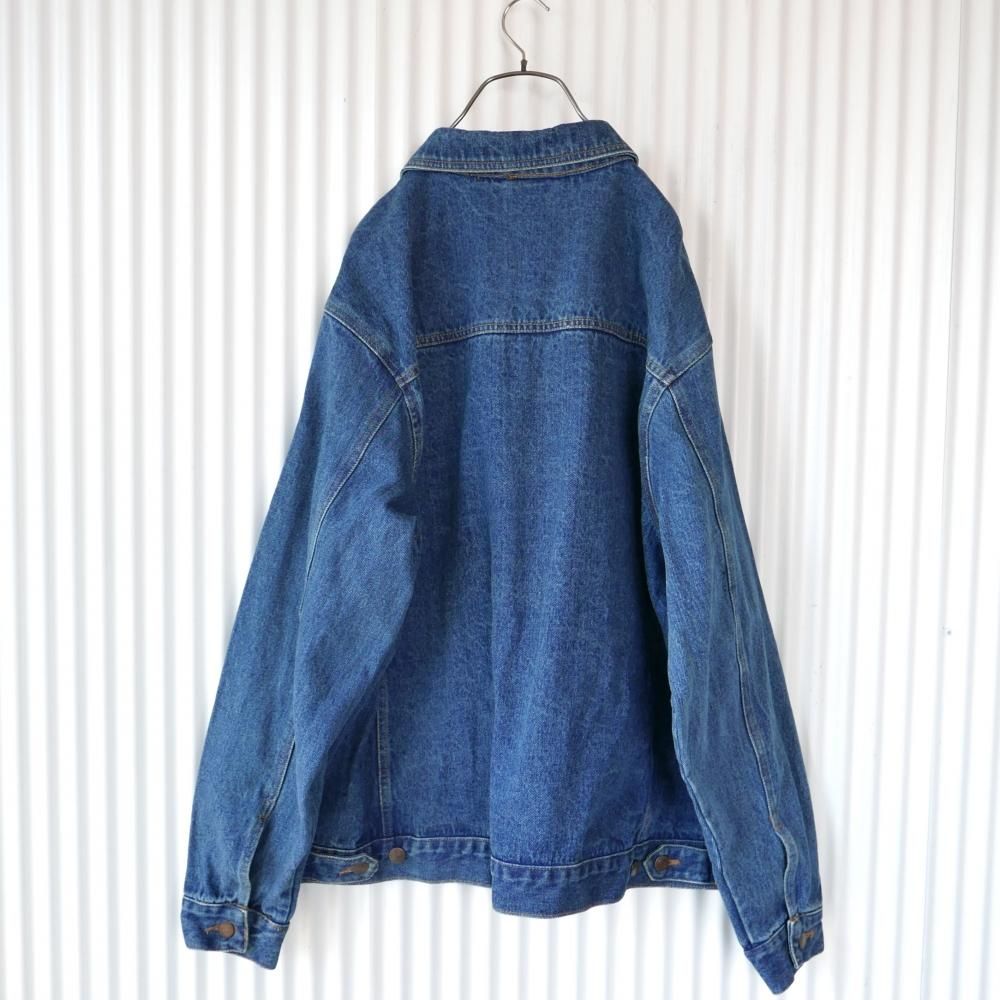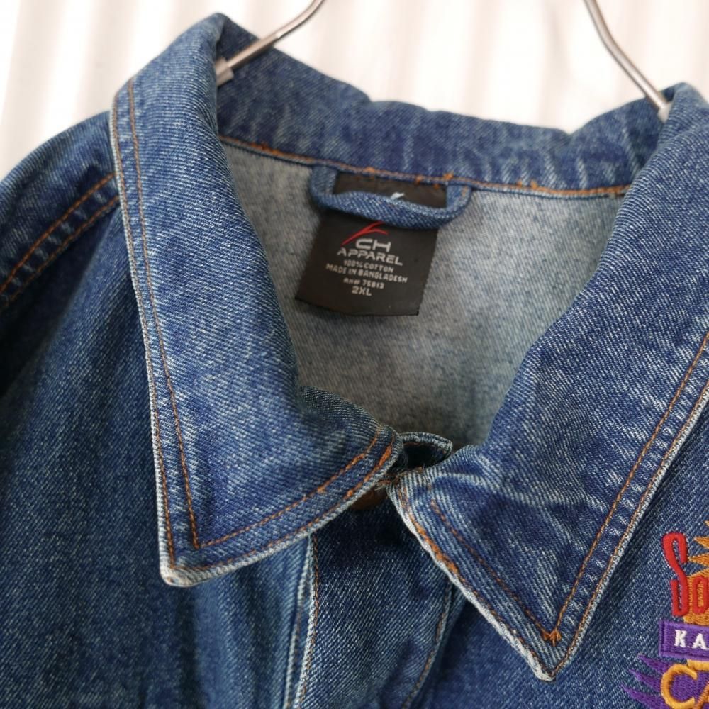 胸の刺繍デザインがポップなUSデニム。BIGサイズで160cmでおしりがすっぽり隠れる丈感で、幅も広め。柔らかさのある生地なので女性が着ても肩が張ることなく、ゆるシルエットで着用できます。