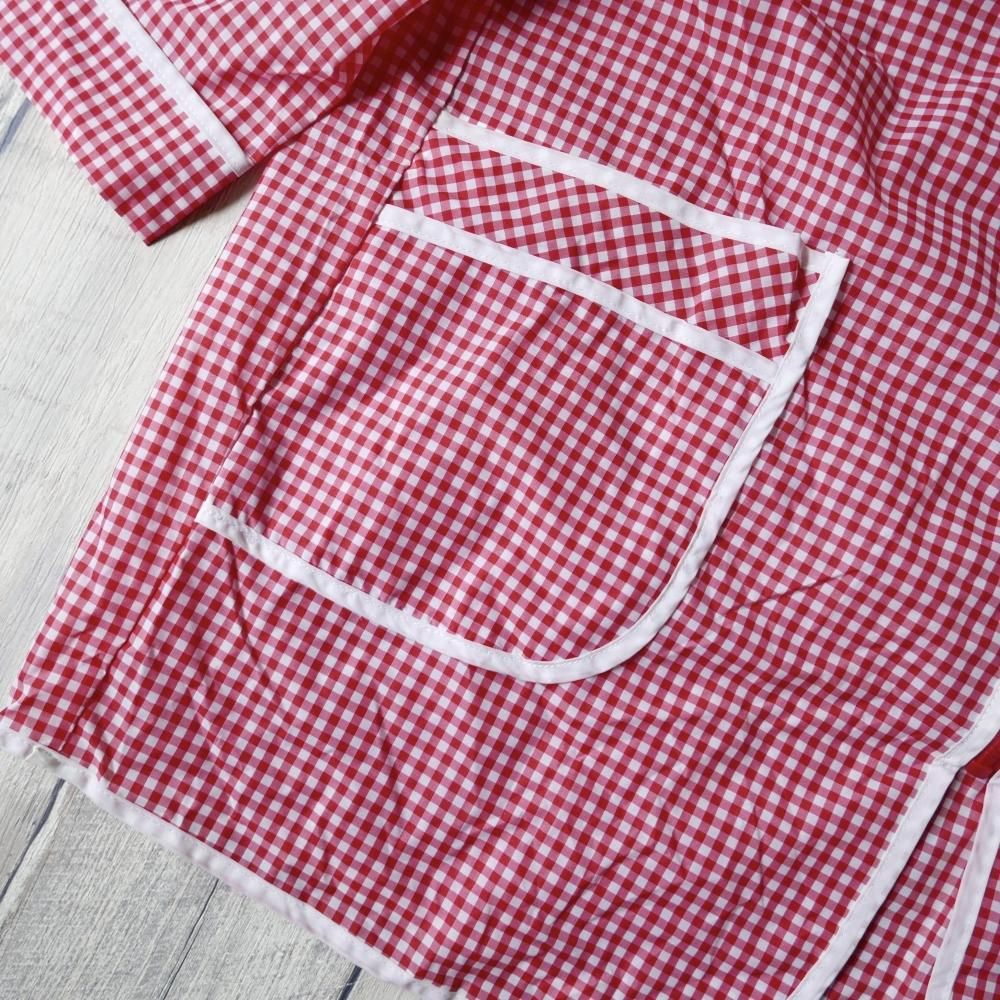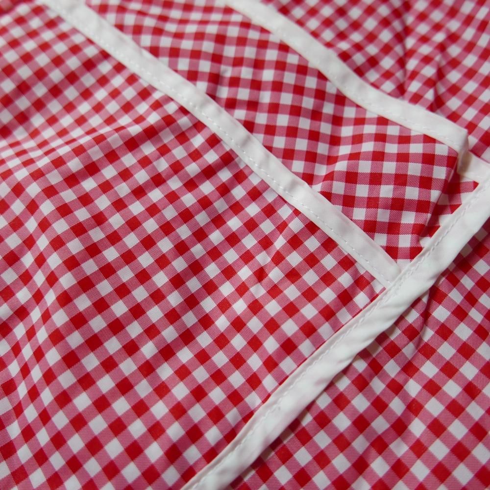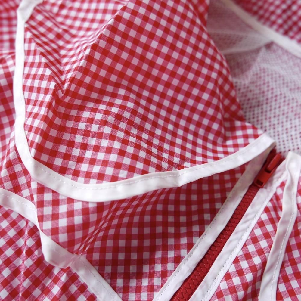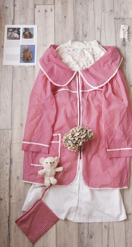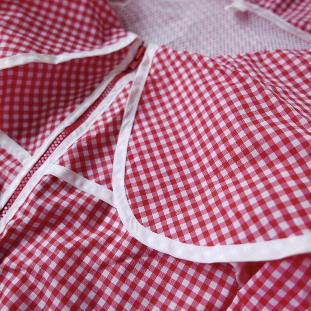 レトロガーリーな赤のギンガムチェックに白のパイピングと大きな丸い襟。襟ぐりが大きく開いてギリギリオフショルダーくらいの珍しいデザインが素敵なレインコート。160cmで膝あたりまでのハーフ丈。同柄の収納ポーチも付いてます。