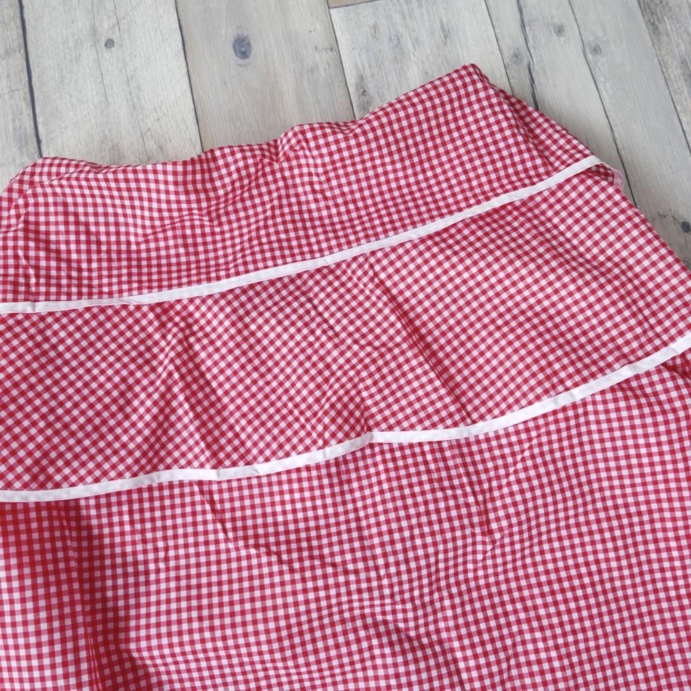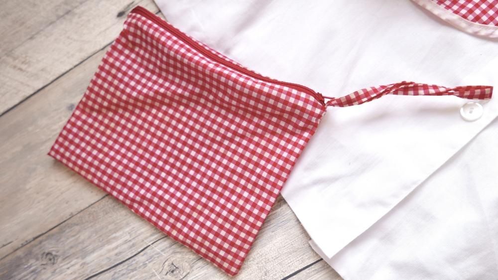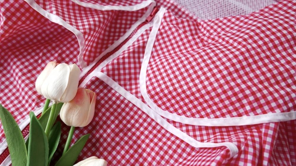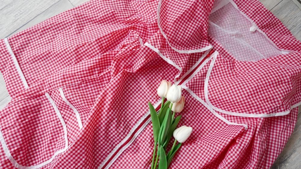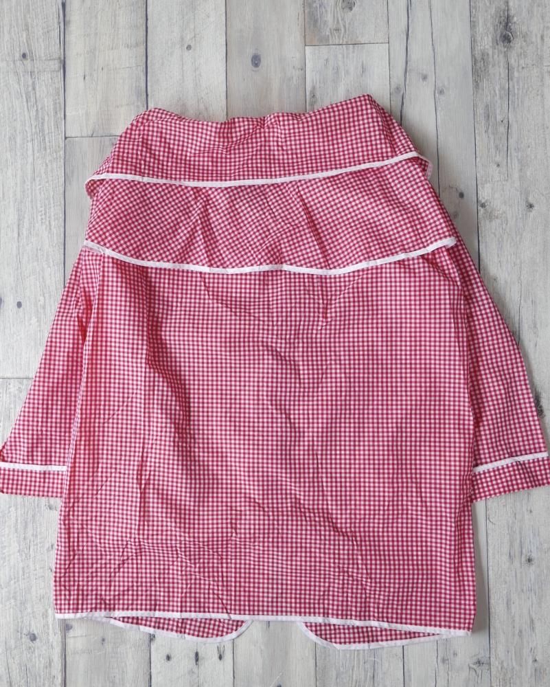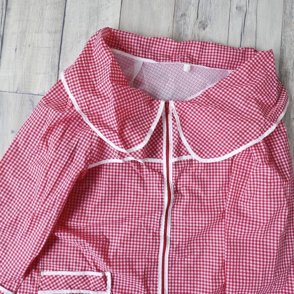 レトロガーリーな赤のギンガムチェックに白のパイピングと大きな丸い襟。襟ぐりが大きく開いてギリギリオフショルダーくらいの珍しいデザインが素敵なレインコート。160cmで膝あたりまでのハーフ丈。同柄の収納ポーチも付いてます。