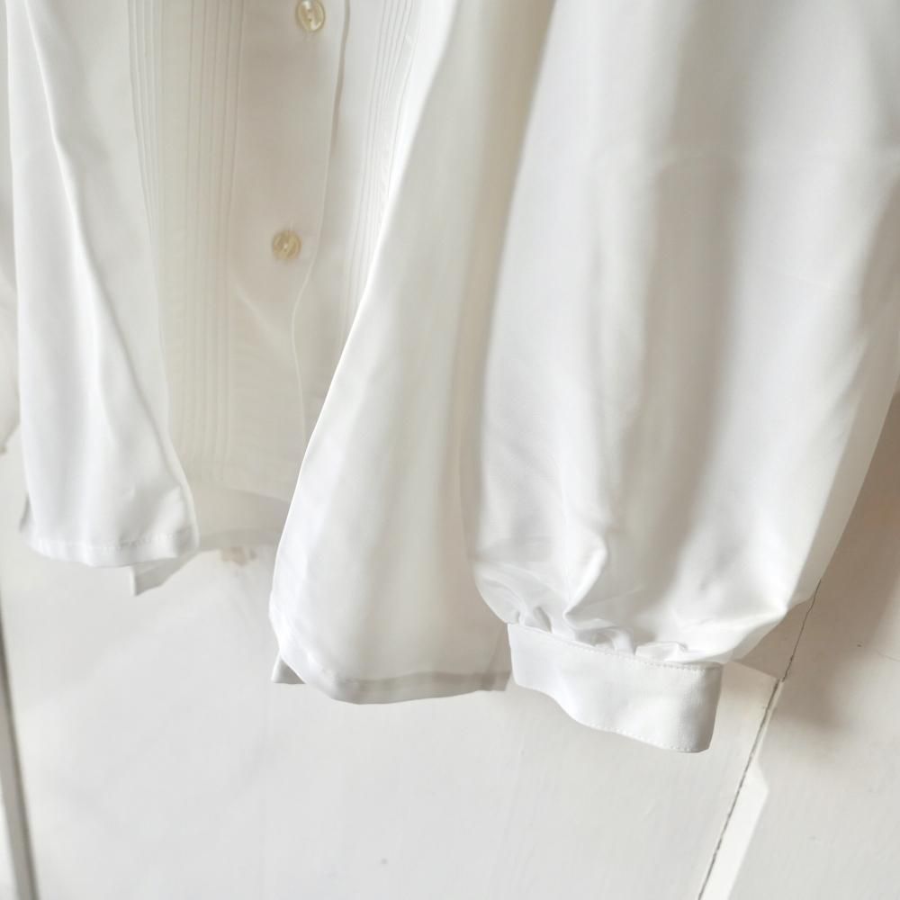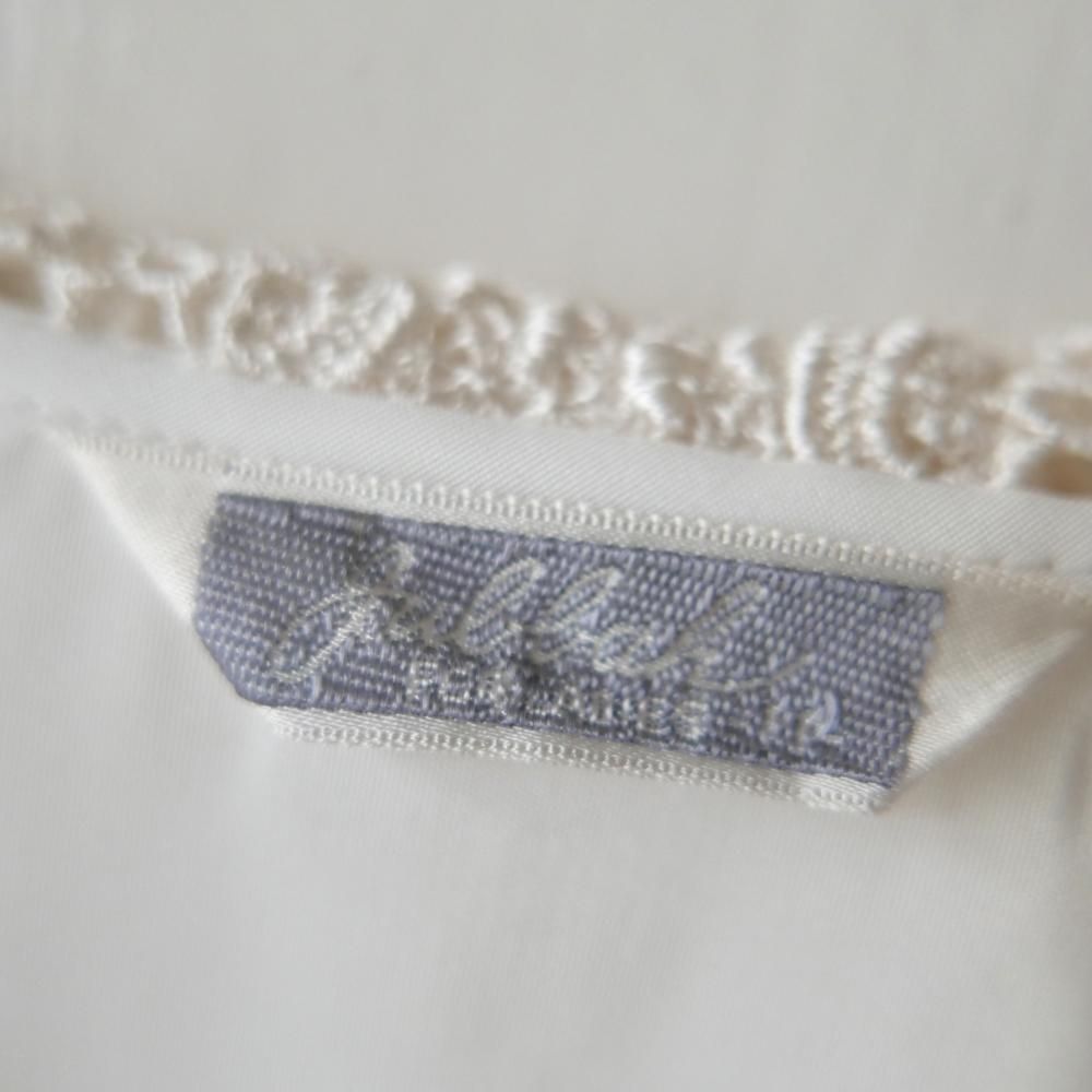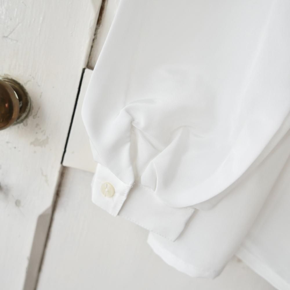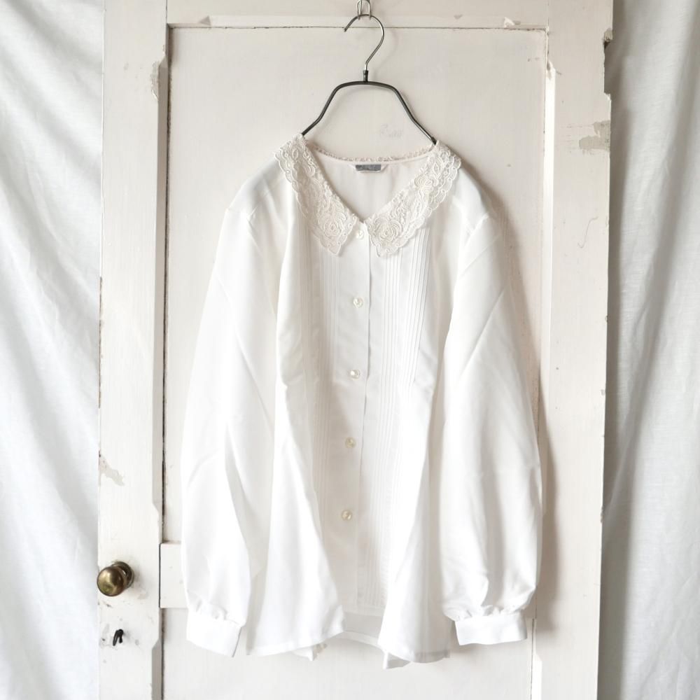 ピュアホワイトのつるりとしたポリ生地に倒しタック飾り。少し広めの襟ぐりに芸術的な美しさのフラワーモチーフのレースで作られた襟。ふんわりボリュームの袖も可愛い。