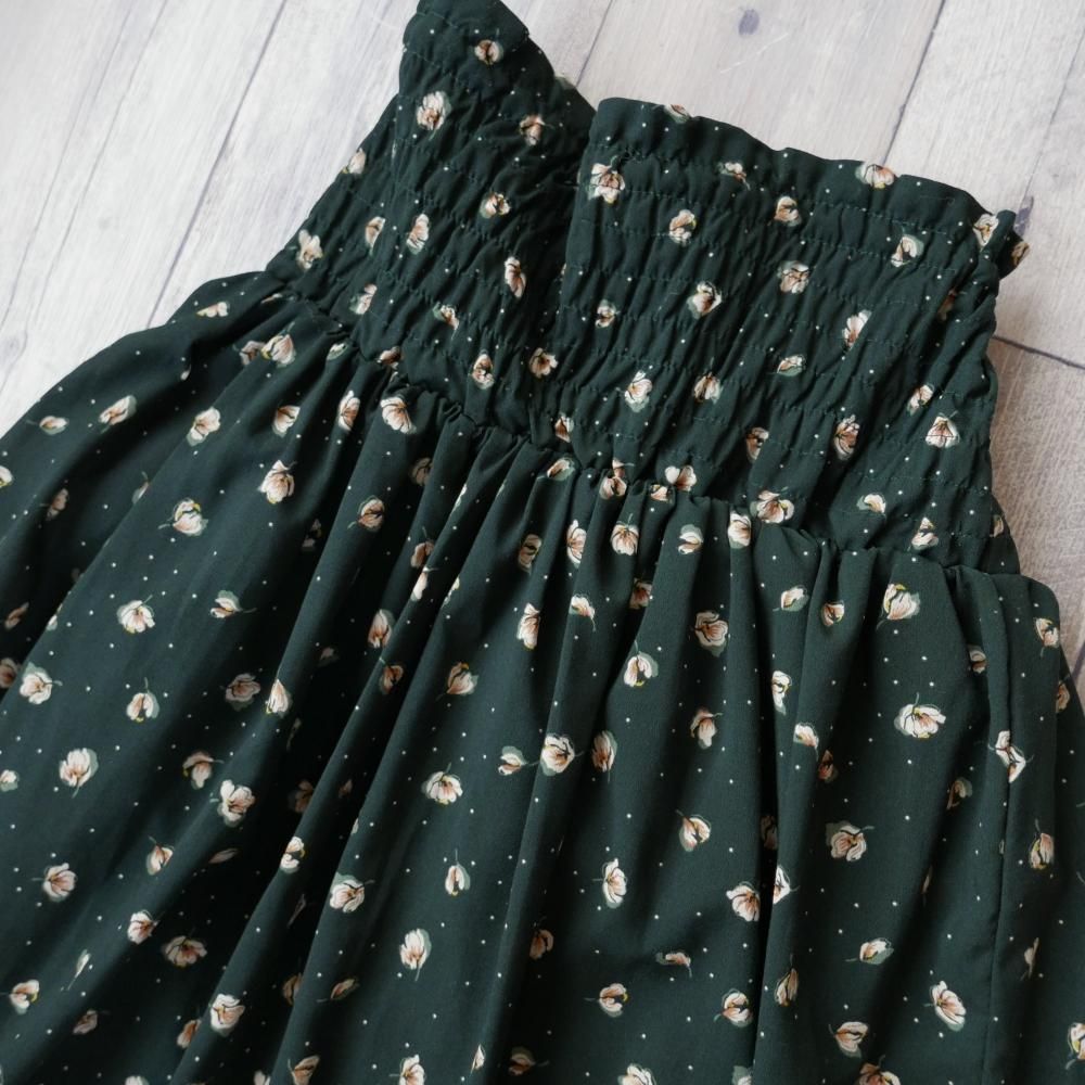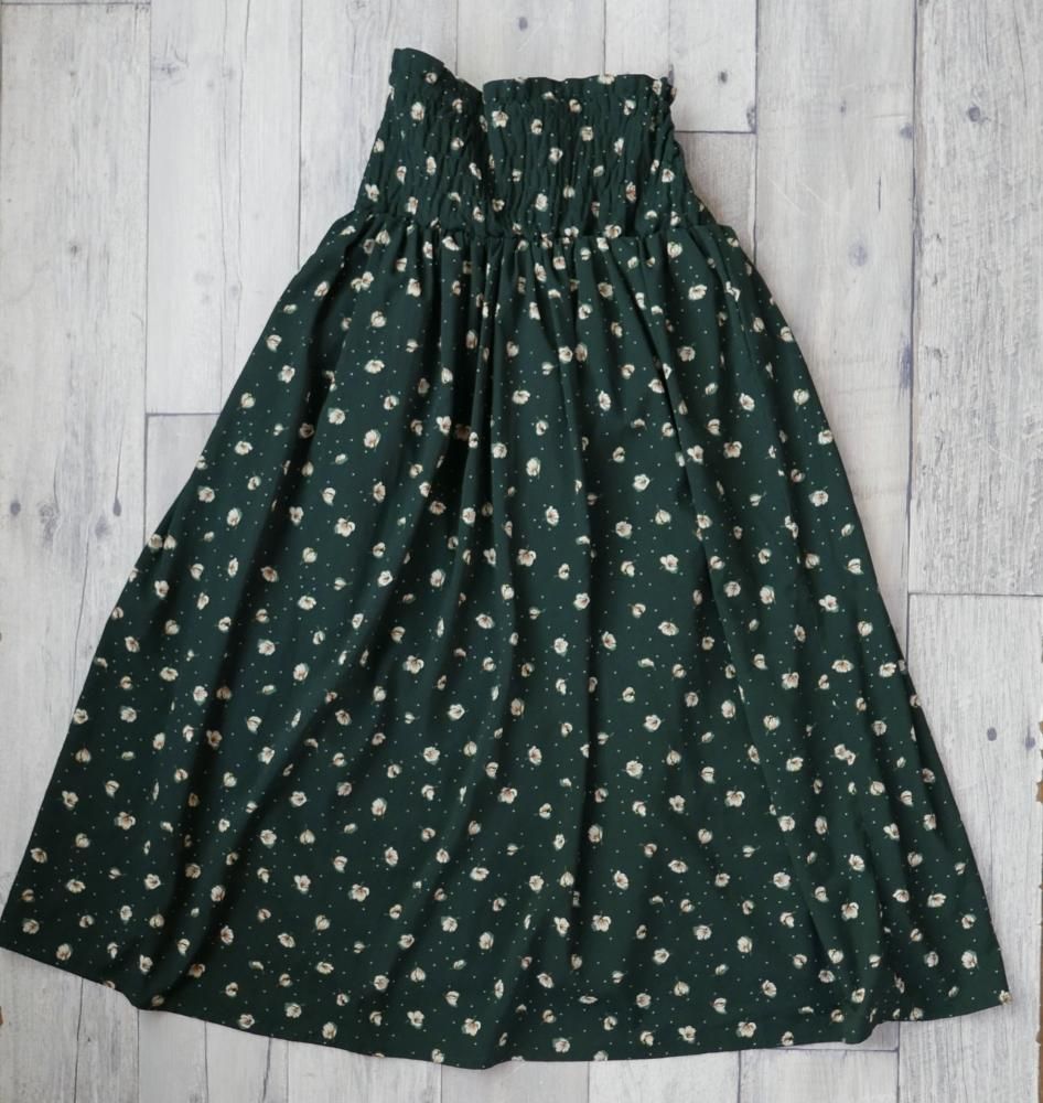 落ち着きのあるダークグリーンのサラリとしたポリ生地に小さな白いお花とピンドット。ウエスト部分は広めのギャザーと紐でくしゃっと。160cmでふくらはぎが隠れるロング丈。