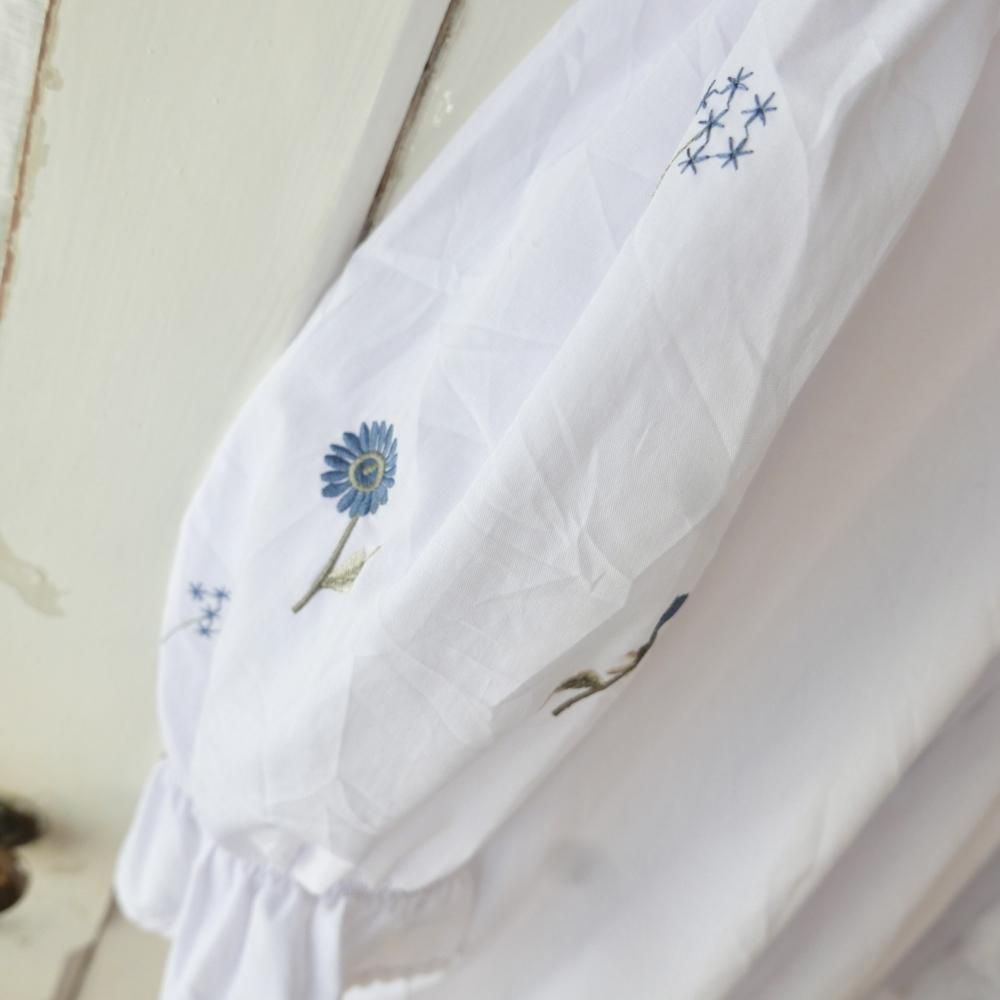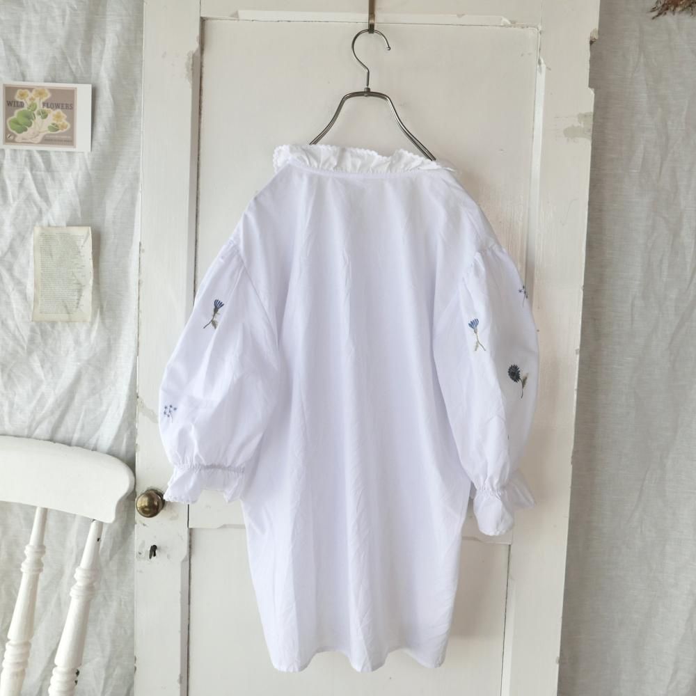 ピュアホワイトの生地にさり気なく大人っぽいフリルショール。ふんわりボリュームのバルーンスリーブは6分丈くらい。そこにブルーのお花たちの刺繍が。ボタンもお花の形。ゆったり大きめのサイズ感で使いやすさも◎