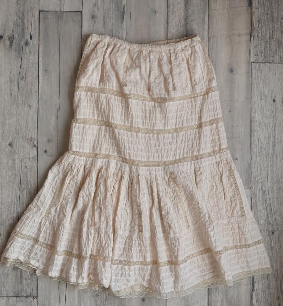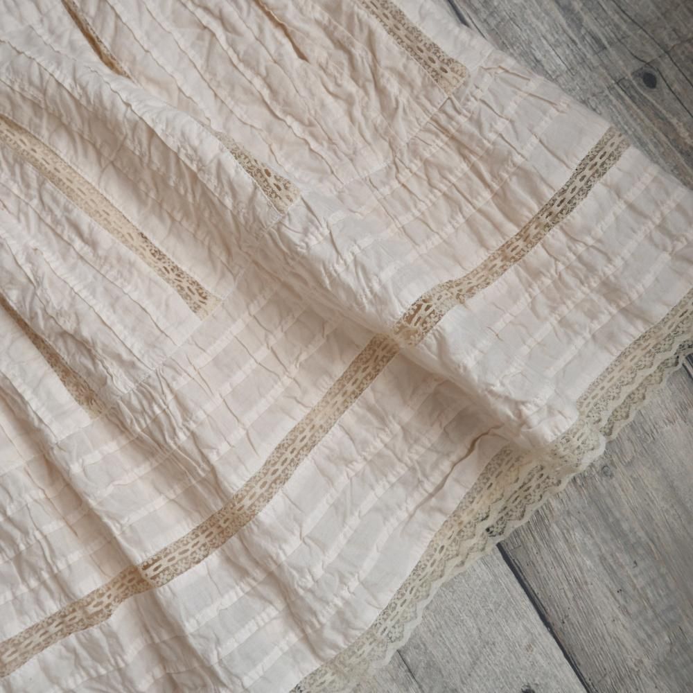 クリームカラーのくしゃっとした薄手コットンにアンティークなイエローベージュカラーのフラワーレース。中ほどからたっぷりのギャザーで可憐に広がるマーメイドライン。ベージュの裏地も付いていてその裾にもフラワーレースが施されています。160cmで足首が見える軽やかなロング丈。