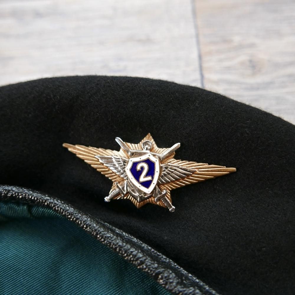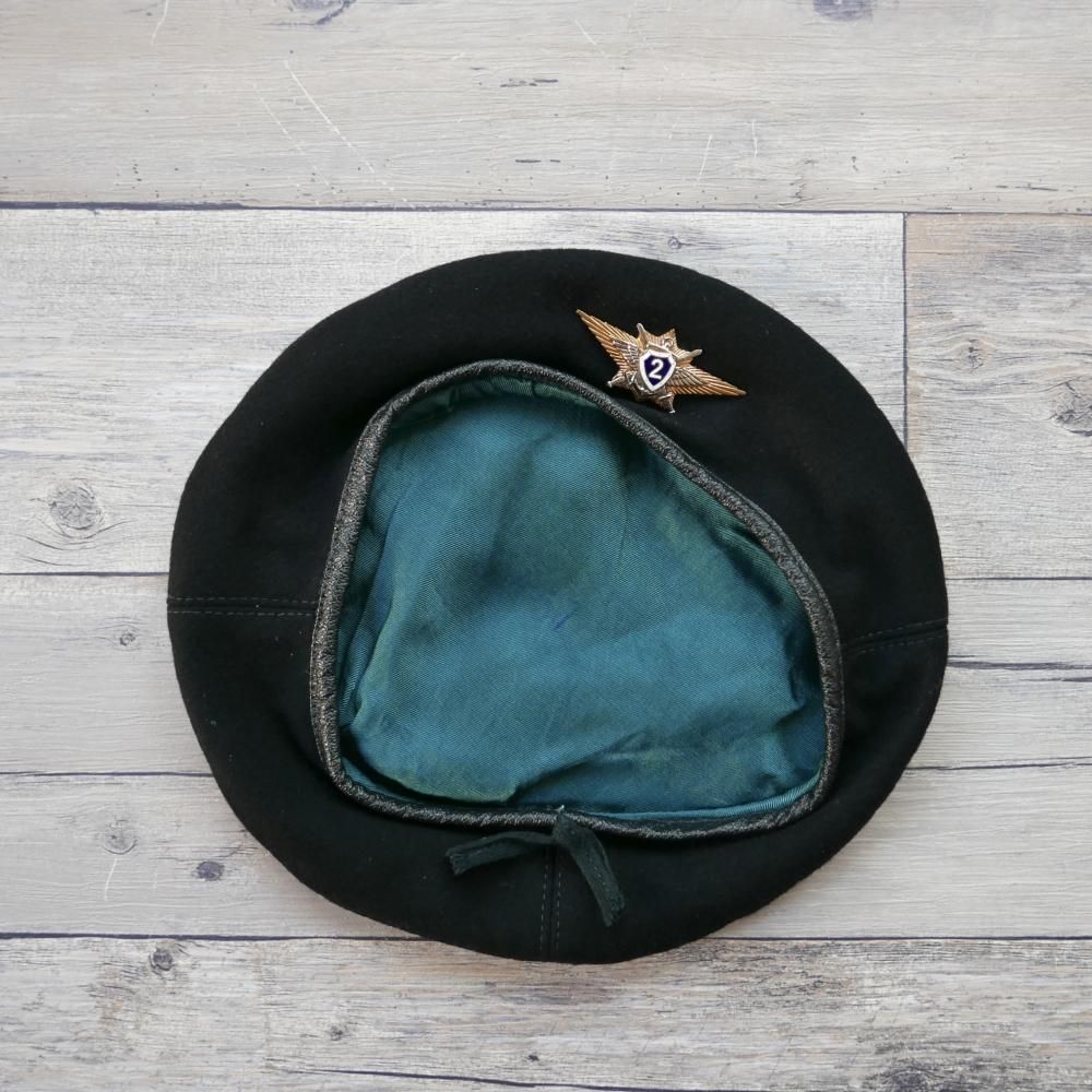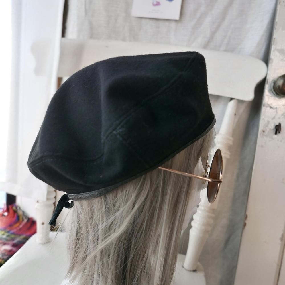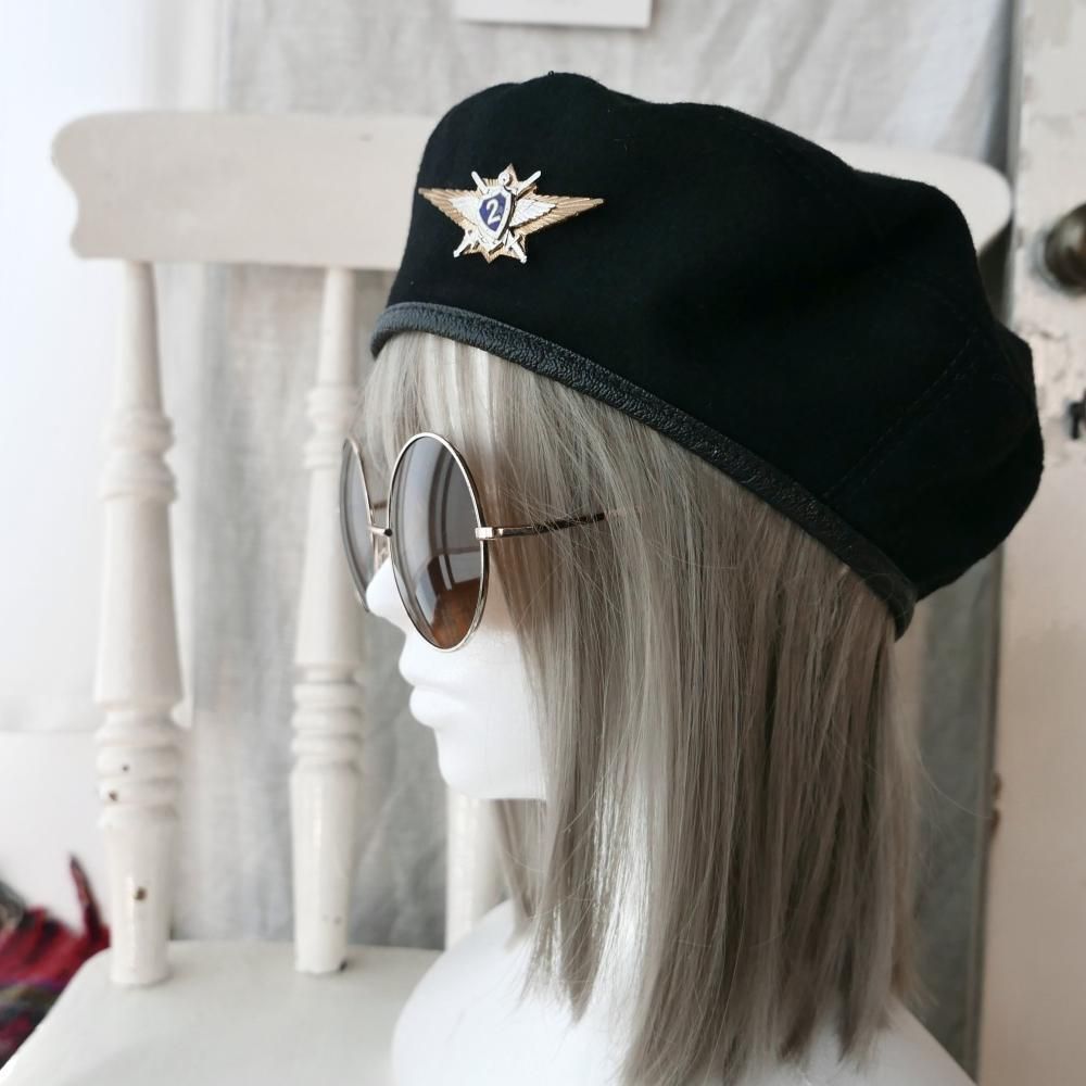 ミリタリーデザインのバッジがフロントに付けられたベレー。黒のウール生地。