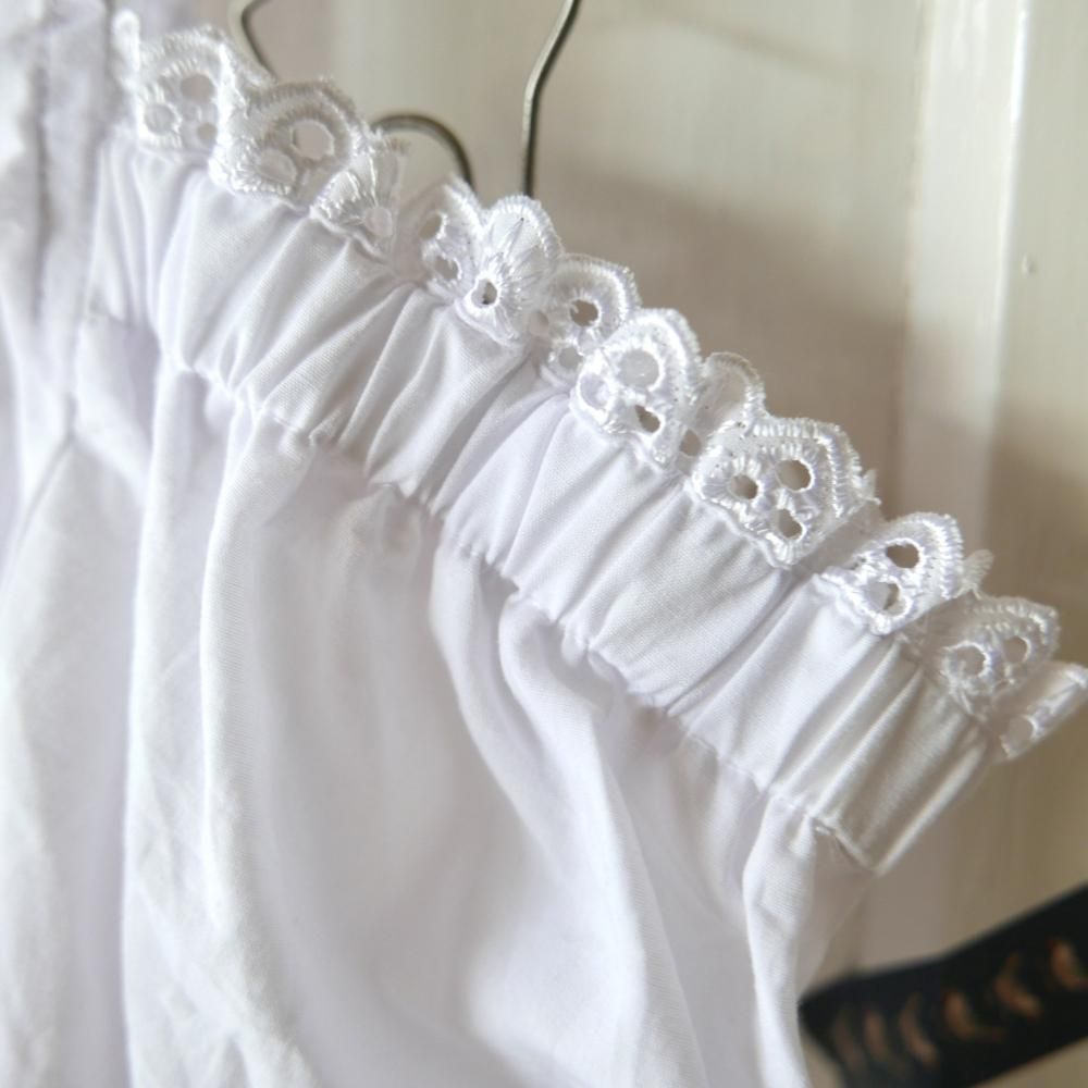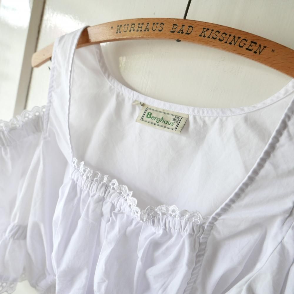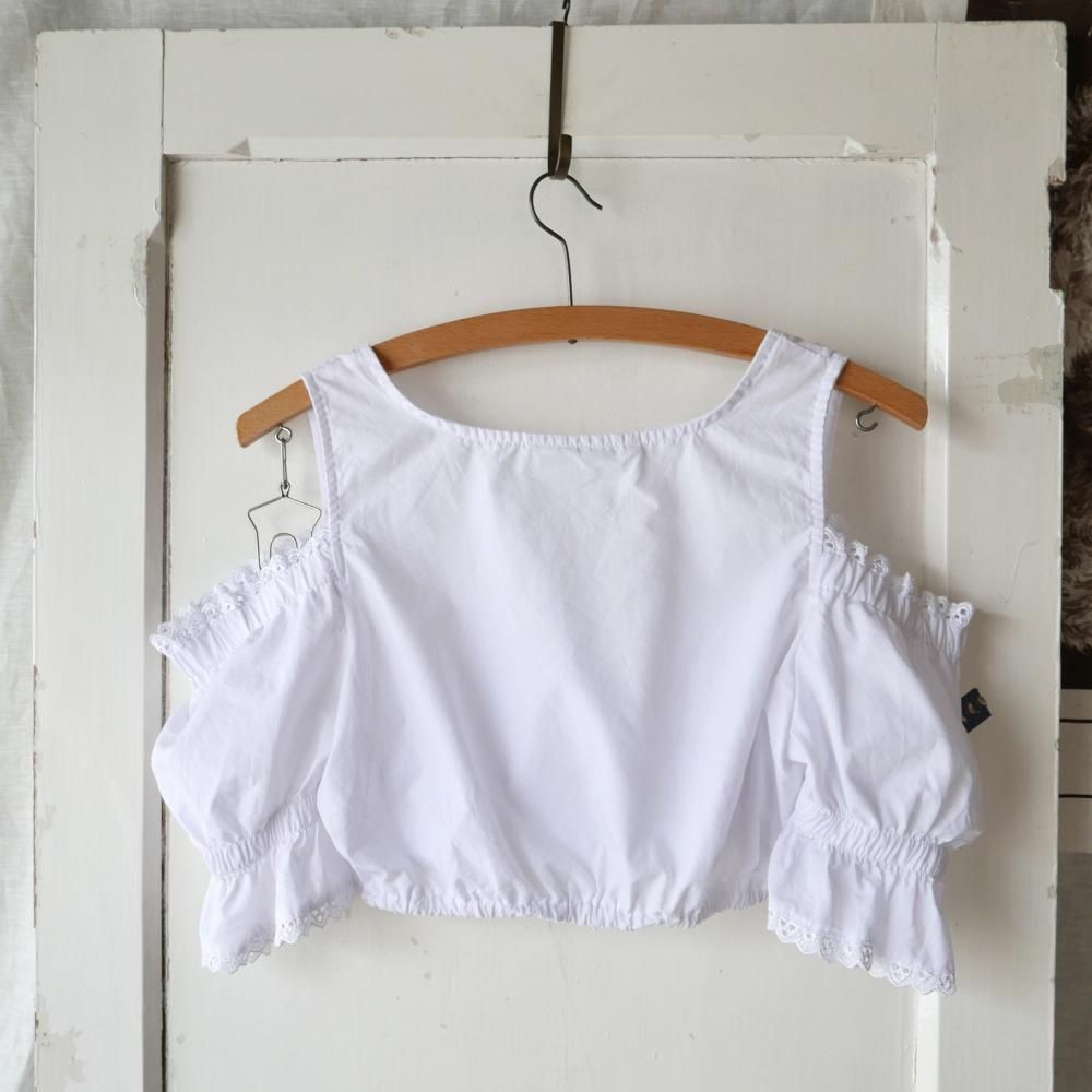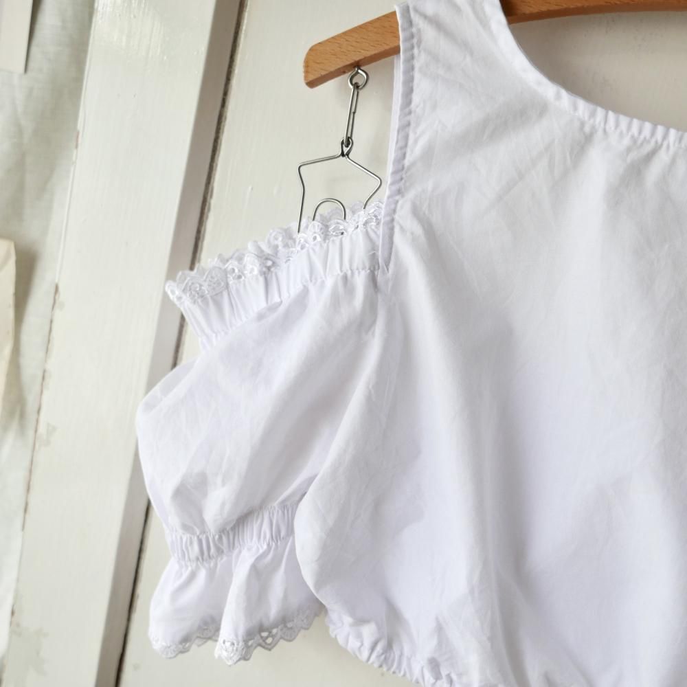 人気のホワイトのチロルブラウス。肩見せオフショルダー。フラワーモチーフのカットワークレースで縁取られた可憐なデザイン。裾はゴムでゆったりめ。