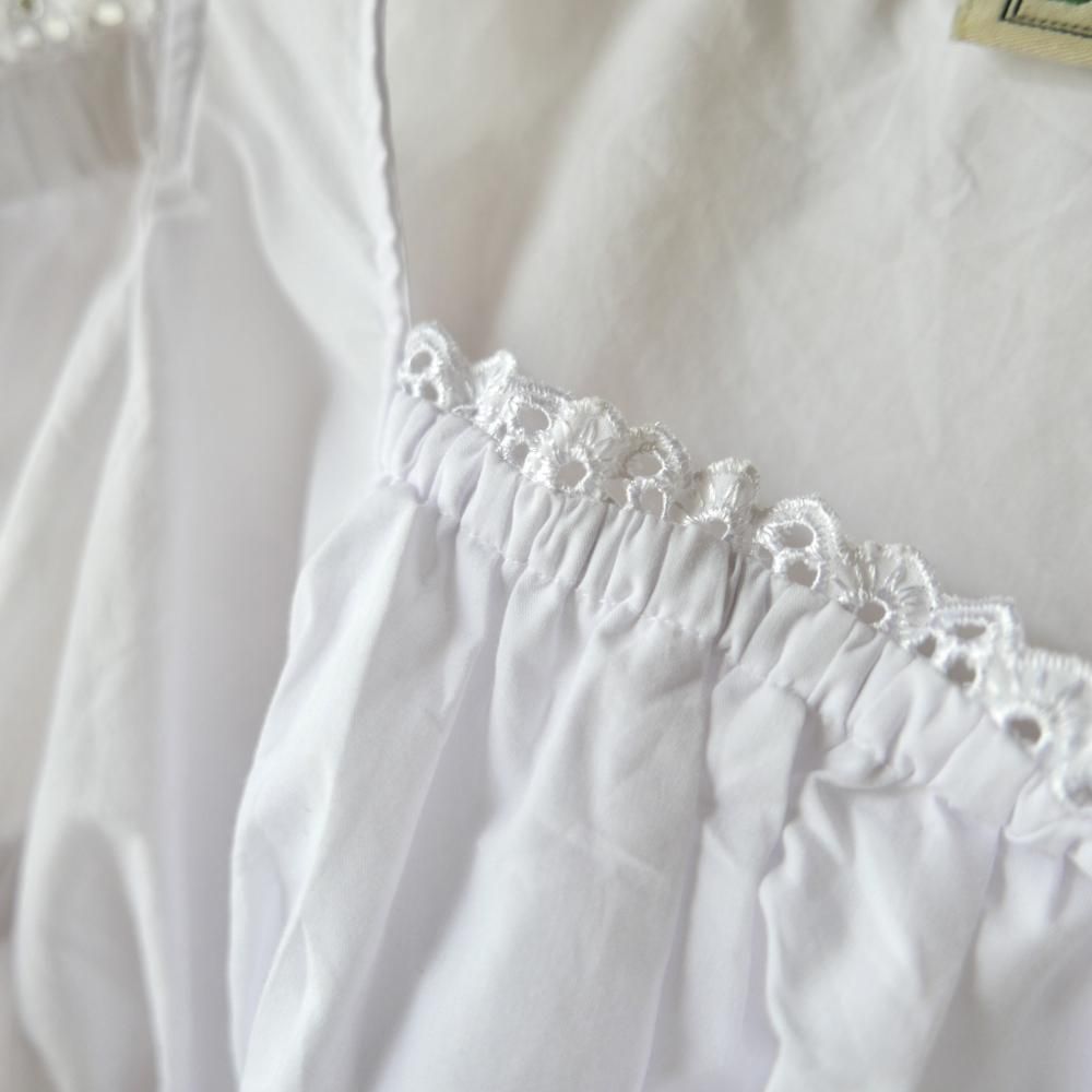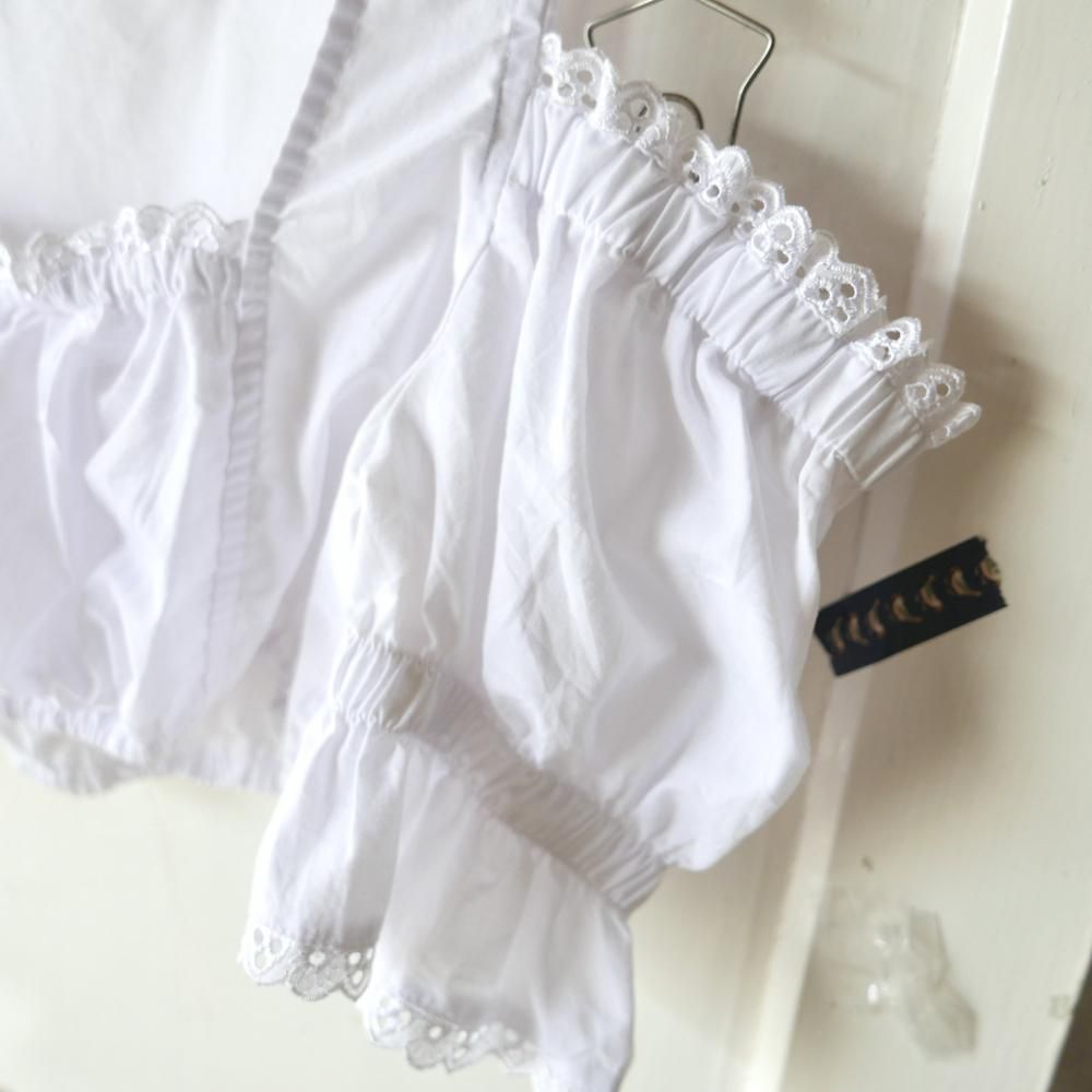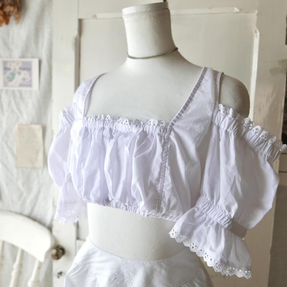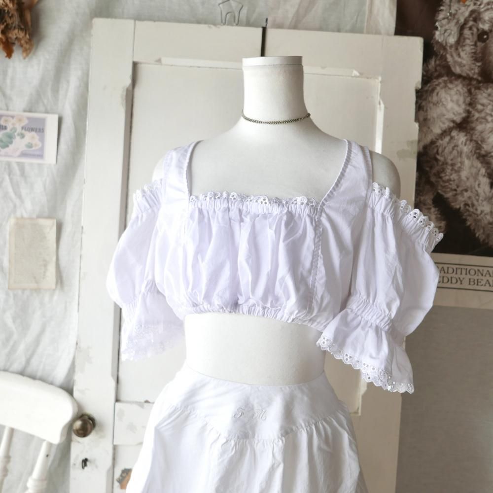 人気のホワイトのチロルブラウス。肩見せオフショルダー。フラワーモチーフのカットワークレースで縁取られた可憐なデザイン。裾はゴムでゆったりめ。